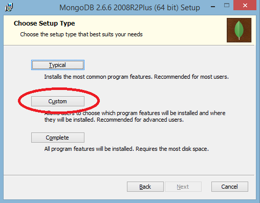 Expand the tree and select all options except "Router". You will only need to install the MongoDB router for a distributed DB and chances are for development you will not need this option. If you think you might need this option, go ahead and install it. Before clicking "Next" - select the root item and click "Browse..." to choose a new directory on a root drive (such as C:/). I highly recommend this as it will make running command line tools much easier without having to use an administrator command prompt. I will be using E:/mongoDB for my install.